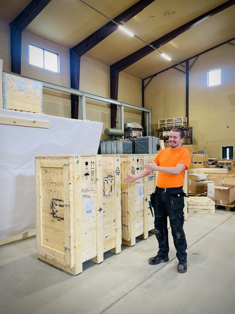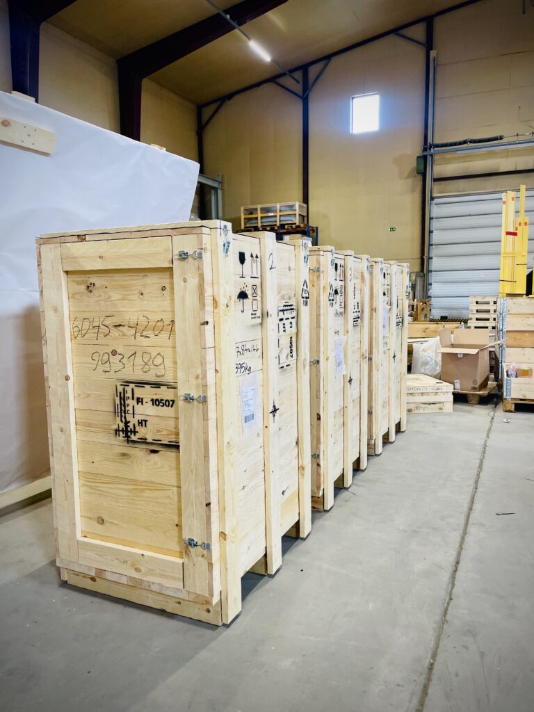 Tällä kertaa asiakkaan tarpeisiin on vastattu laatikkosarjalla, jossa linkuilla suljetaan etuseinä. Näin sisällä oleva tuote voidaan huoltaa määränpäässä, laittaa etuseinä yksinkertaisesti uudelleen kiinni, ja lähettää tuote huollettuna takaisin Suomeen käyttöön. Tarvittaessa voidaan suojata tuote lukoillakin.