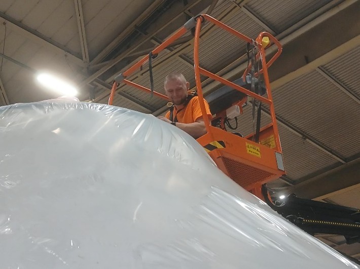 Tällä kertaa saimme tehtäväksemme suuren roottorin huolellisen paketoinnin muoviin kuljetusta varten.